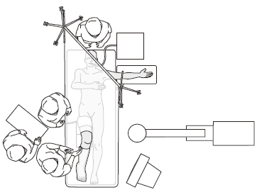 主刀医生和助手立(或坐)于受伤肢体一侧,手术室的工作人员站在主刀医师旁边,将透视机器放置在对侧,屏幕放置在手术团队和透视技师都能看到的位置(图6.8.1‑10)。