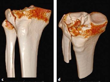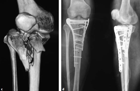 图片图6.8.1-24a-d 胫骨平台双髁骨折一名46岁男性机动车车祸时右腿受伤a 术前X线正、侧位;b 胫骨平台的轴位片;c 骨折的三维重建;d 术后X线正、侧位片