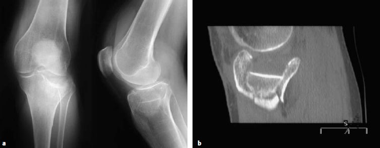 a 一例65岁女性的41B3型骨折;b CT矢状切面显示关节面塌陷;c 关节面复位后,使用骨替代物来填充骨缺损区域,采用锁定头螺钉和外侧支撑钢板来进行牢靠固定。