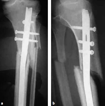a-b X线显示左侧胫骨的节段性骨折。骨折近端有多条骨折线和一个楔形骨块,但是它们都没有移位或移位程度很小。整个骨折可以通过一根髓内钉进行固定,但是由于骨折位置非常高位,因此髓内钉手术将非常具有挑战性,因此最终选择采用MIPO技术进行钢板固定