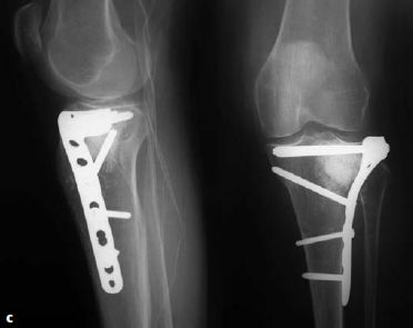 还有一种特别的骨折类型,同时累及双髁以及胫骨结节,胫骨结节上带有完整的伸膝装置附着,应用拉力螺钉或小钢板(用作张力带)来加强固定非常重要,这样有利于早期的功能锻炼[18]。对于累及后侧柱的C型骨折,后方的入路,例如倒L入路将有助于实现精确的复位。