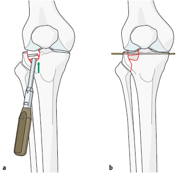 关节内骨折的复位通常需要切开关节囊后,直视关节时进行操作。对于外侧胫骨平台骨折,可以向外翻转骨折块及其软组织附着,以直视关节面的压缩。塌陷的区域和骨块可以从下方使用顶棒仔细地抬高;股骨髁可以作为复位的参考模板(图6.8.1‑15),此时应同时留意髁间窝区域,特别注意一下前、后交叉韧带的情况。