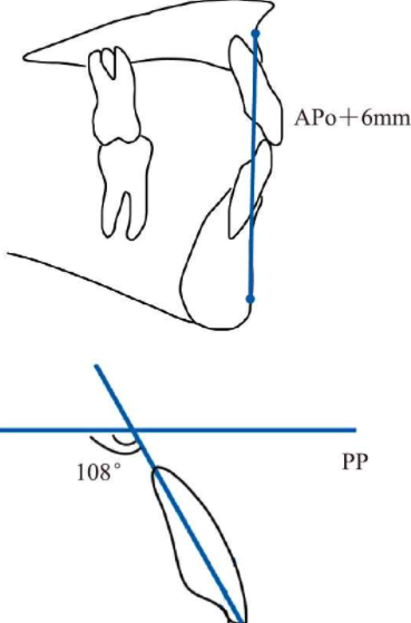 上前牙切端的垂直角度应该位于上唇下缘3~4mm,前后向上,切端位于APo线前6mm,长轴与上颌PP平面成108°(图2)。