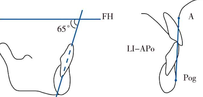 首先找到下前牙根尖区,在其附近寻找到下颌骨正中联合的中心点。从这一点开始做FH平面的相交线,相交角度为65°。这个设定的65°相交线就是理想下前牙的长轴。理想的下前牙切端位置距离APo线的位置为0或1mm(图1)。