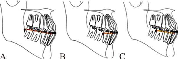 矫治结束后,上前牙要轻度内收,或者下前牙唇倾;这就是前牙对Ⅱ类骨骼的代偿。UI-PP角度会小于108°。按照Ⅰ类的标准设定上下前牙理想位置后,根据上下前牙之间的咬𬌗关系和患者主诉要求重新调整上下前牙位置。IMPA的角度有可能达到100°,LI-APo线距可能是+2mm。Alaxander警告说下前牙近远中向位置的改变不要超过2mm。这是原则,并不是不能逾越的底线,有些时候下前牙可能唇倾得更多,但是我们要警惕复发,越唇倾越容易复发。从改善Ⅱ类面型的角度来说,保持下前牙直立是最佳选择,但这要求上前牙要充分内收,后牙通常都是强支抗设计(图4)。