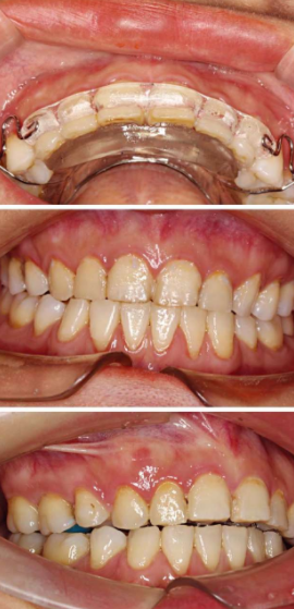 下颌生长会使Ⅲ类反𬌗加重,而且不可控制。生长发育期之前的Ⅲ类反𬌗矫治详见早期阻断性矫治。这里只讨论那些生长发育结束之后的Ⅲ类反𬌗矫治。Ⅲ类反𬌗的代偿性矫治,上前牙唇倾,UI-PP角度可能会大于117°,下前牙舌倾,IMPA角度可能会小于95°。所有的上下前牙代偿要受到下颌骨的限制,下前牙应该直立于基骨,或者稍微舌倾。上前牙唇倾也是有限度的,很多反𬌗的患者在反𬌗解除后通常还会抱怨继发的问题:就是上前牙过于唇倾(图9)。