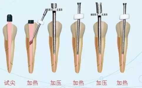 5、根管充填前需彻底干燥根管,防止根管内液体干扰,根管内若有残留液体将严重干扰携热器工作尖温度的上升和牙胶的软化程度。