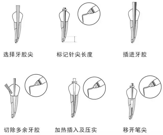 携热器工作尖尖端大小直径应与距根尖4~5 mm(有学者提出3~4 mm)处根管直径大小相匹配。携热器工作尖向根尖方向挤压深入时,应注意不与根管壁接触,以避免热损伤。