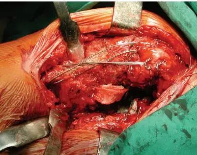 图3:术中照片显示,大转子骨折合并巨大的溶骨性病变(见图1),在用同种异体骨 Q0 填充缺损处并紧紧扭转八字形钢丝后,骨折复位良好。采用同种异体结构移植物修复小粗隆缺损区。
