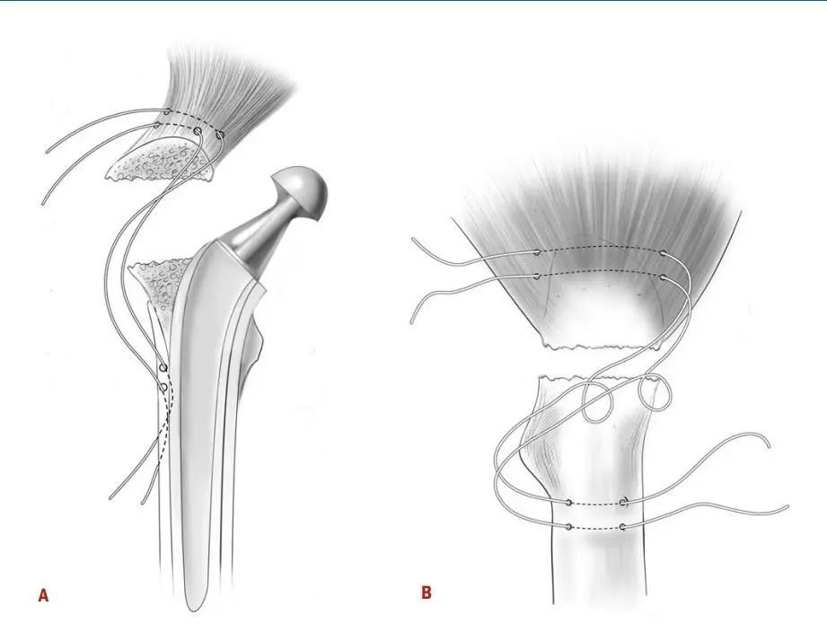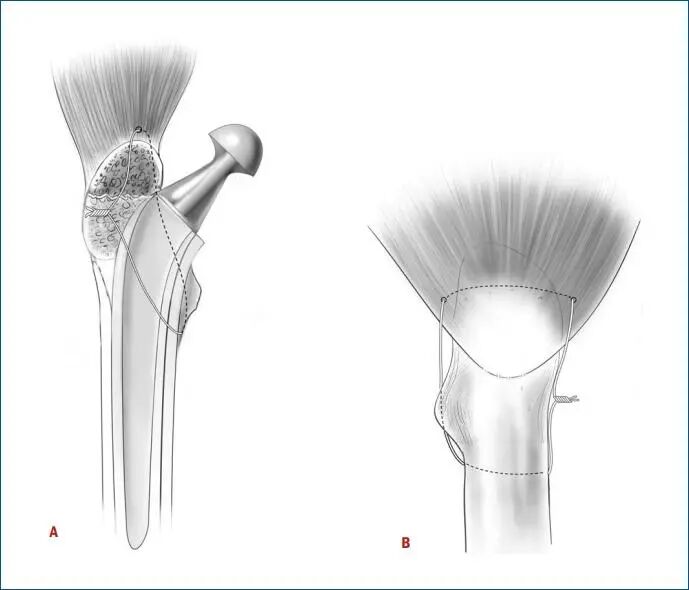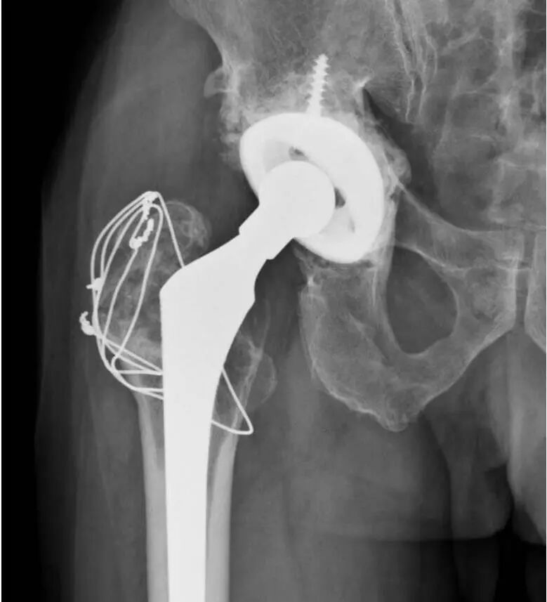 溶骨性病变引起的大粗隆骨折可能是全髋关节置换术后的晚期并发症。对于这种复杂并发症的最佳治疗方法仍然存在争议。大粗隆骨折伴溶骨性病变是一个日益普遍的问题,一些研究者建议非手术治疗,使用拐杖和限制负重。还有人建议在翻修前使用外展矫形器3个月以促进骨折愈合。一些作者建议,继发于聚乙烯磨损碎屑的溶骨必须手术治疗,特别是如果溶骨病变很大,只剩下大转子的贝壳状皮质。