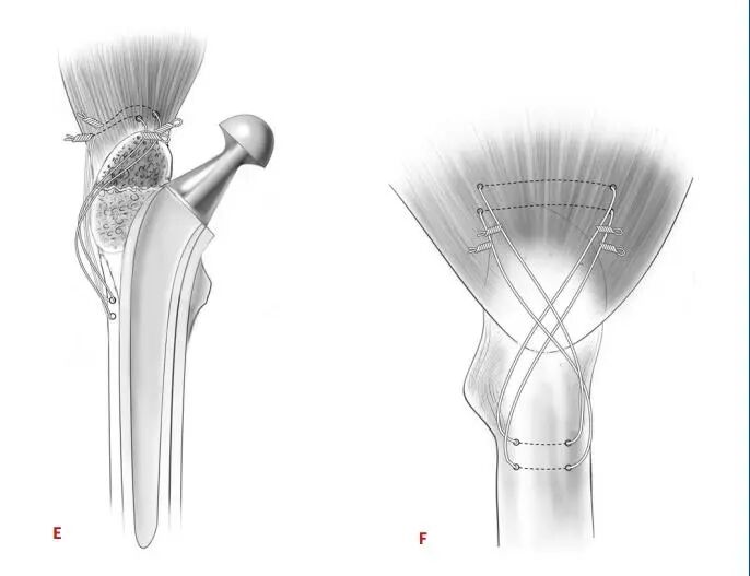图2:说明大转子张力带钢丝固定技术图。A和B:髋关节正位和侧位,显示两根钢丝穿过股骨外侧皮质的钻孔,位于溶骨性病变下方远端,上方大粗隆尖端,呈八字形。C和D:髋关节正位和侧位,显示8字形钢丝在扭转前的位置,而助手使用复位钳将大转子的碎片重新接近股骨近端。E和F:髋关节正位和侧位,显示用颗粒状同种异体骨填充缺损处并用钢丝紧紧缠绕后,大转子重新附着。