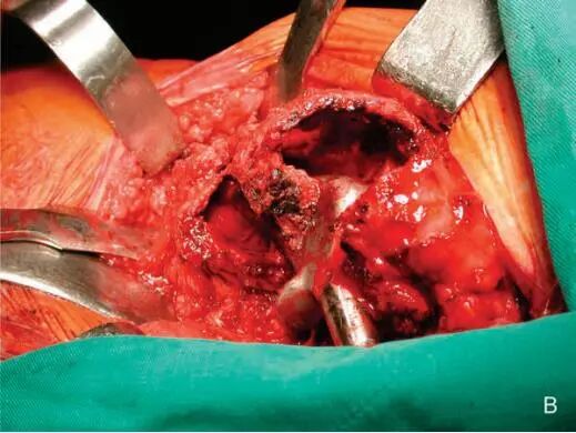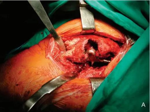 图1:术中左髋部照片,患者的溶骨性病变导致大粗隆骨折,在股外侧做倒L形切开后,股骨粗隆下区域的外侧皮质暴露,并在清理纤维组织后清晰地显示骨折部位。B:溶骨性病变彻底清除后,大转子和小转子的巨大缺损清晰可见。