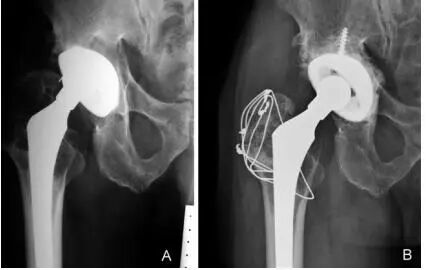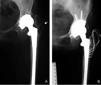 图6:A和B,一位69岁男性假体周围骨盆骨溶解,无骨水泥全髋关节置换术后12年的大转子和小粗隆的右髋位X线片。A:翻修手术前的x光片。B组:髋臼假体翻修一年后行大转子切开复位内固定,2根张力带钢丝和1根斜环扎钢丝,辅以异体骨移植,显示大转子骨折愈合。
