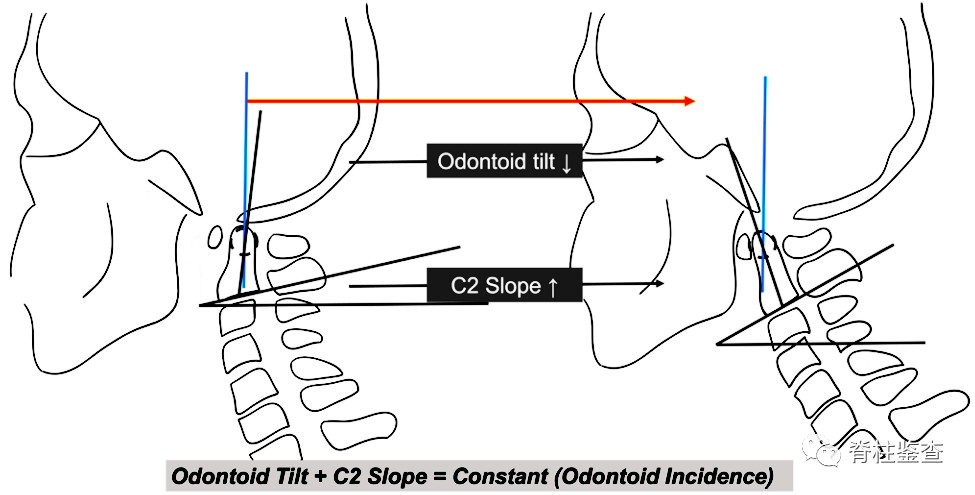 研究表明,齿状突入射角是从上起影响颈椎矢状位序列的一个重要因素,齿状突入射角与C0-2Cobb角呈负相关,与C2-7Cobb角呈正相关。与骨盆入射角一样,齿状突入射角是与颈椎解剖相关的恒定参数,骨盆入射角从脊柱的尾端开始,而齿状突入射角从脊柱的头端开始。因此,齿状突入射角是一个可靠的参数来评估颈椎序列在个体间变化。