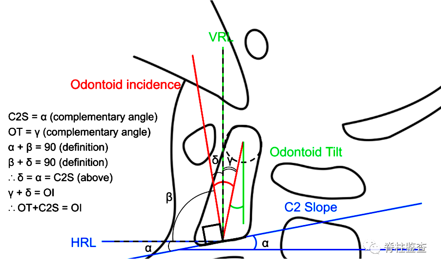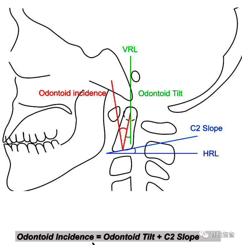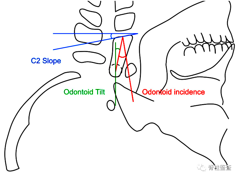 齿状突入射角(OI):垂直于C2终板并过其中点的线与连接该点到齿状突中心的线之间的夹角