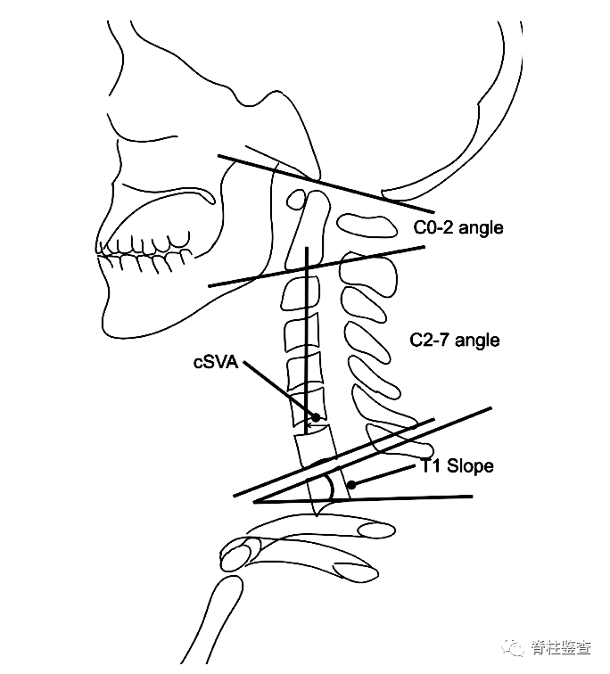 测量C0-2、C2-3、C2-4、C2-5、C2-6 及C2-7的Cobb角,T1倾斜角(T1 slope,T1S)、 C207矢状面垂直轴(C2-7 sagittal vertical axis,cSVA)、胸椎后凸(thoracic kyphosis,TK)等。