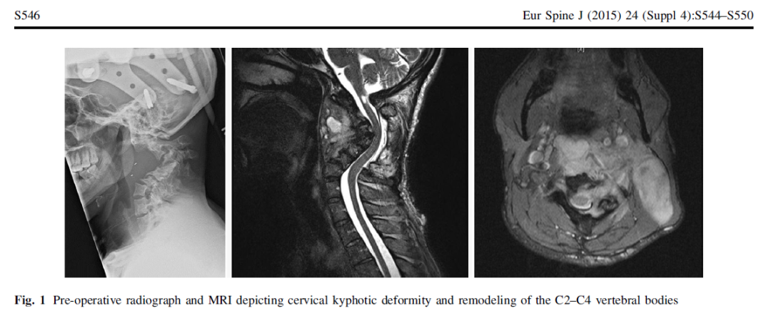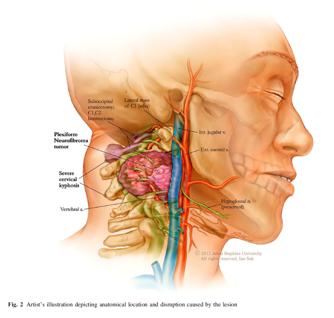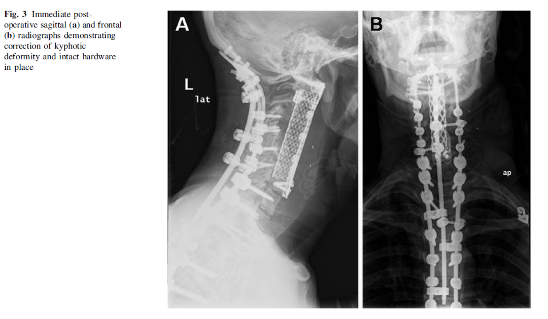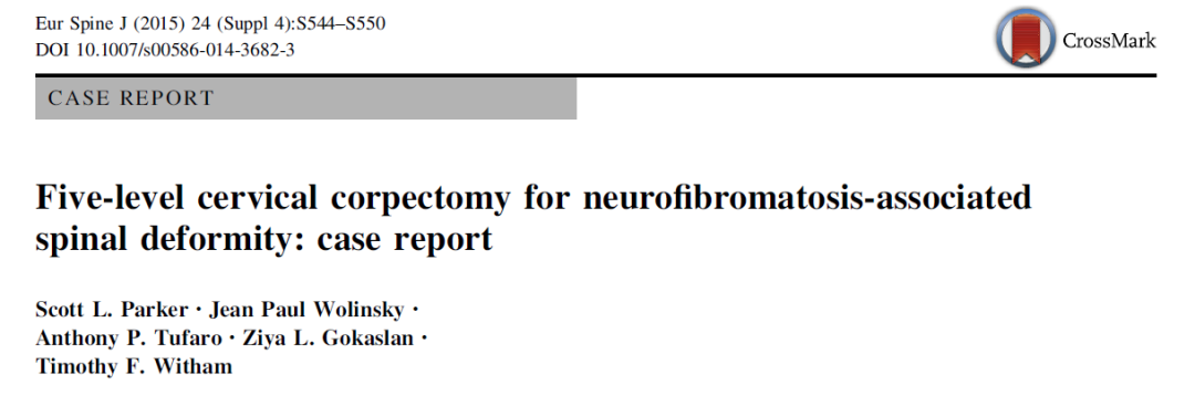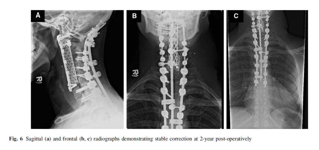 1. 5节段。2015年,霍普金斯大学Parker医生。神经纤维瘤病伴后凸畸形,C2-C6椎体次全切除(corpectomy)。2期手术,先前路,手术时间830min,出血600ml。3天后后路手术,时间500min,出血800ml。术后住院20天,术后保留气管切开和胃管数天,术后第2天出现轻度肺栓塞,术后7天出现肺炎。转康复科住院2周。