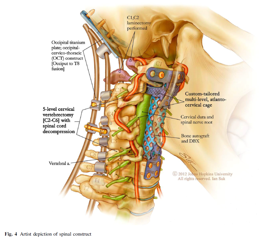 3. 6节段。2011年,意大利罗马Catholic大学Massimiliano医生。脊索瘤,C3-T1椎体次全切除(corpectomy)。