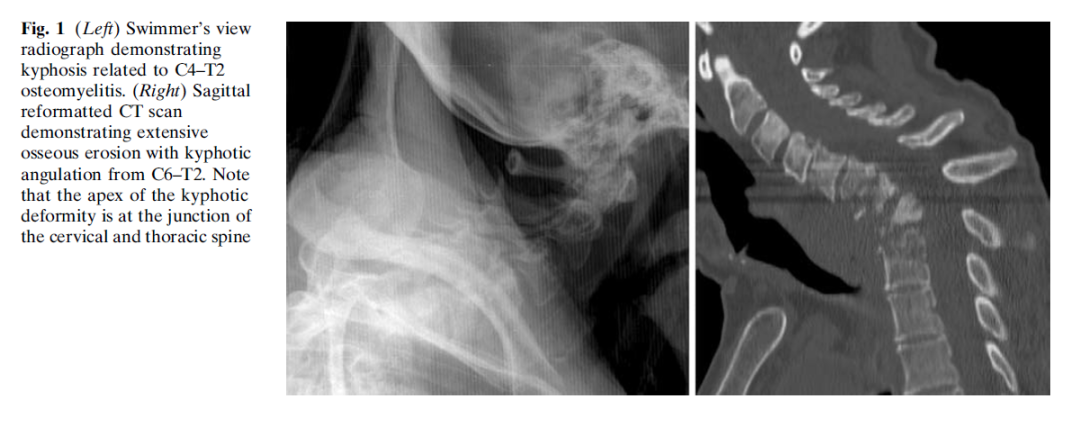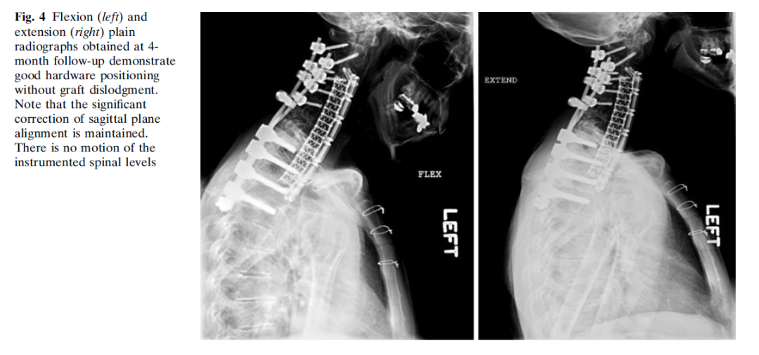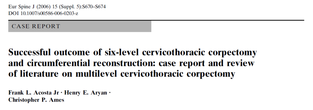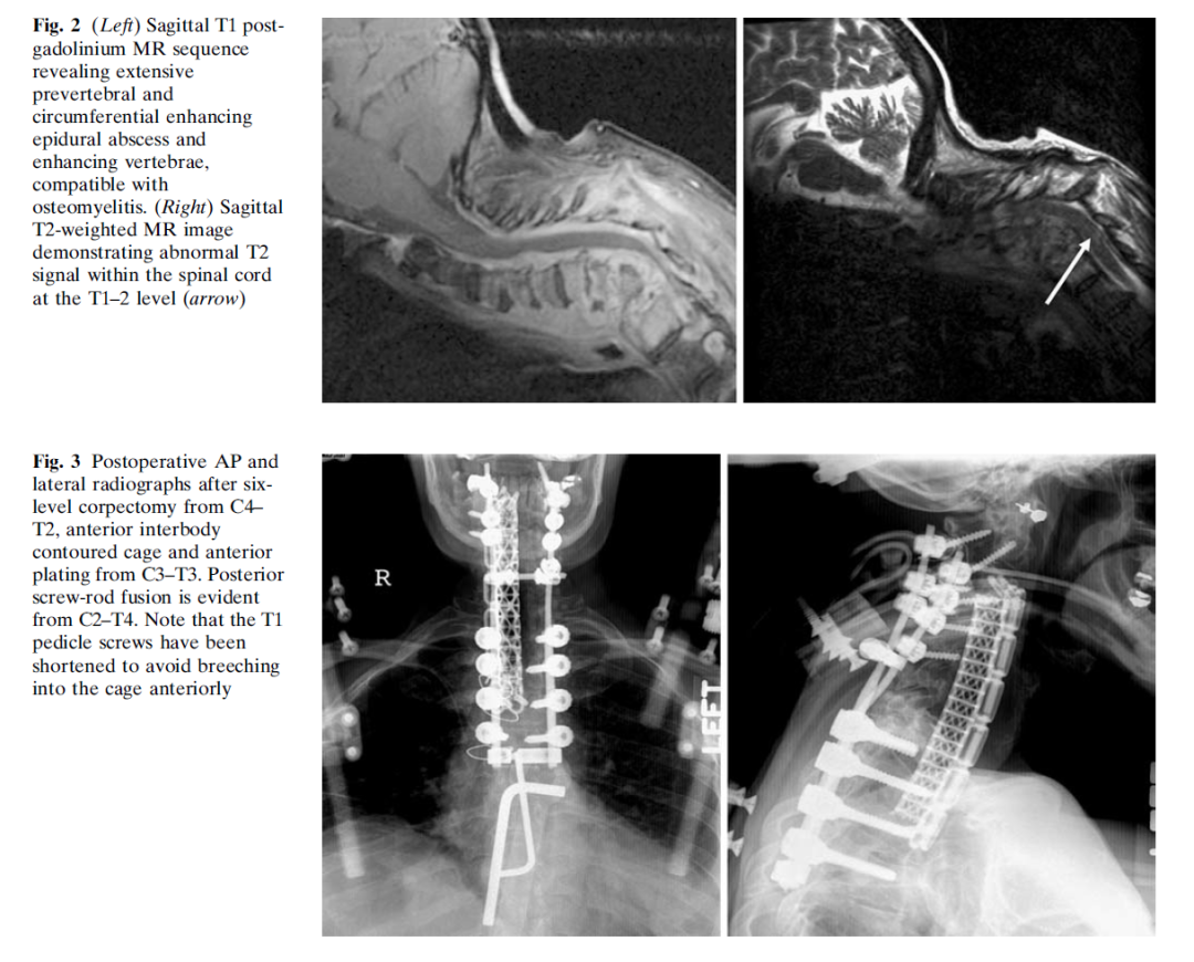 2. 6节段。2006年,UCSF Acosta Jr医生。颈椎骨髓炎,C4-T2椎体次全切除(corpectomy)。前后路,手术时间8hr,出血2000ml。住院30天。