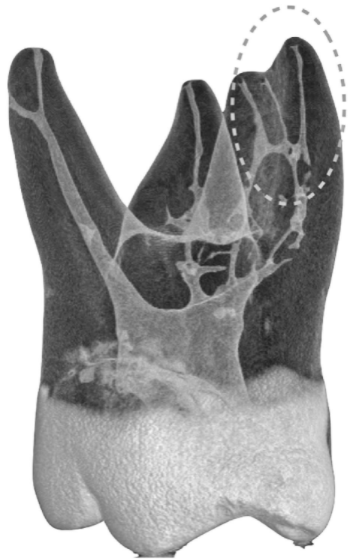近中颊根的研究和临床观察研究较多,双根管比例为52.24%,内部根管形态极其复杂,由于这种复杂性,临床操作中应该始终考虑在近中颊根有两个根管,这个额外的根管位于近中颊和腭根管口之间的某处,有时该根管口的位置很靠近中,一个菱形的入口预备可以帮助找到这些位于近中的根管。在很少的情况,近中颊根有3个根管。