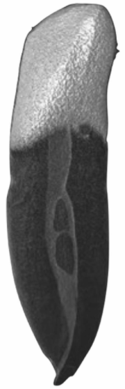下尖牙舌面有舌嵴,将舌侧窝分为近中、远中两部分,因而开髓的窝洞也正好通过舌嵴。下颌尖牙通常为单根管,近远中径相对比切牙宽,很少发生牙髓疾病,偶尔有两个牙根和两个根管,平均根尖直径为0.3mm,根尖孔至解剖根尖距离为0.35mm。