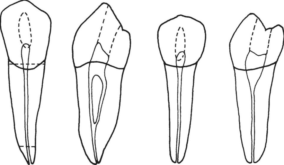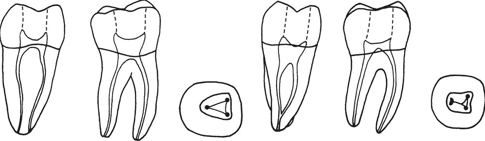 前磨牙的近、远中径向颈部缩窄,即其近、远中径在𬌗面宽,在颈部窄;颊、舌尖内有细而突起的髓角,在充填备洞时,此处最易穿髓。根管在牙颈部的横断面为极细长的椭圆形,有时呈哑铃状。牙根极扁;上颌第一前磨牙牙根多分为颊、舌二根,但分歧部位比较接近根尖,不论是一个扁根或分为二个根时,大多有两个根管,比例超过75%,三根管发生率为0~6%,根管的分歧部位接近根尖。