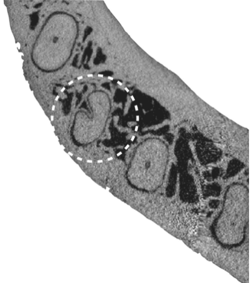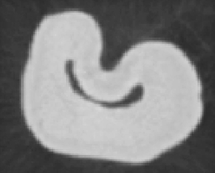 下颌第二磨牙根管系统与下颌第一磨牙近似,通常为近中2个根管,远中1个根管,但当近远中根两根在颊侧融合时,根管亦相通连,根管断面呈马蹄形,有时易将两根管在颊侧相连处,误认为是髓底穿通,应当注意加以区别。39%的下颌第二磨牙可呈“C”形牙根和根管。C形磨牙是根据牙根和根管的横断面而命名的。C形磨牙有一个180°或更大弓形的带状根管口,开始于近中舌侧线角,横越颊侧,止于髓腔的远中部分,不是几个分开的根管口。在根管口以下,C形磨牙牙根的结构可有很大的解剖多样性。
