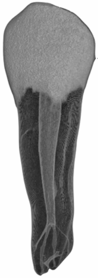 上前牙为单根管牙,通常其根管较粗大。上颌中切牙根管在牙颈部类似三角形,向根尖孔方向逐渐变圆,上颌中切牙多根管很少见,但副根管和侧支根管多见,其中有45%的牙齿其根尖孔远离根尖部,平均距离为0.3mm,根尖直径平均为0.4mm。上颌侧切牙通常为一根管,平均根尖直径为0.4mm,根尖孔距根尖平均长度为0.3mm。10%的上颌侧切牙出现侧支根管。