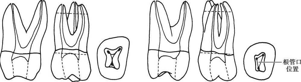上颌第二磨牙单根管比例接近50%。上颌前磨牙的根管形态较为复杂,变异较多,开髓时要注意窝洞的形态与位置,应与颈部的断面相对应,注意方向,尤其是位置不正的牙齿,要防止从近中、远中侧壁穿孔。