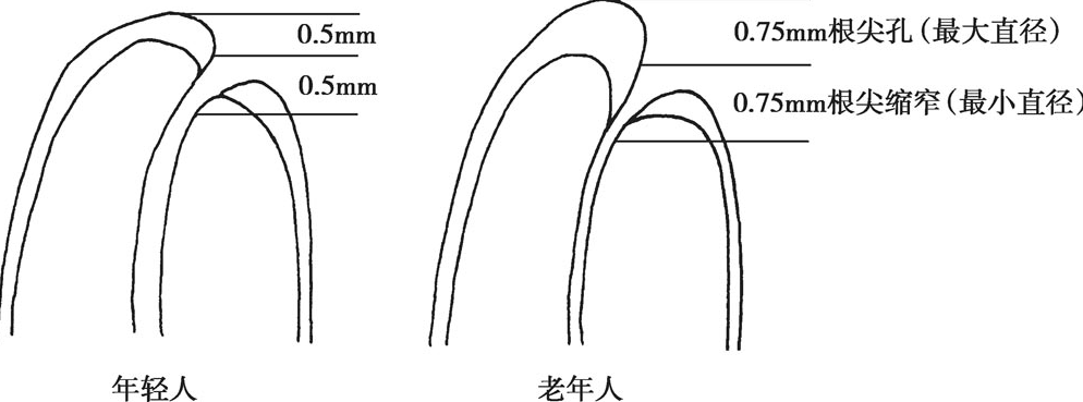 随着年龄的变化,根尖区牙体组织不断沉积,根尖孔的形态会发生改变,孔径变小变窄,位置也发生移位。