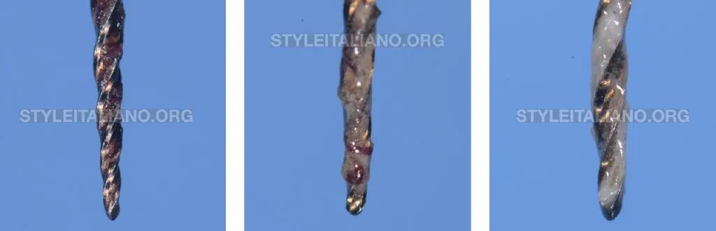 我们必须增加锥度或直径准备或同时增加锥度和直径准备以消除牙髓组织。图中从25.08开始进行预备(充满红色碎屑);其次是30.09(部分红色碎屑);40.06(白色碎屑)。在某些情况下,尤其是牙髓模糊时,血液可能来自根尖周组织。在这些情况下,了解血液来自哪里是很重要的,因为在最后一种情况下,增加直径和锥度可能会对牙齿的抗断裂性产生负面影响。