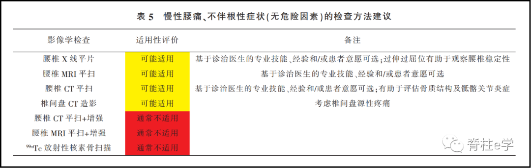 慢性腰痛、不伴根性症状(无危险因素)的检查方法建议见表5。
