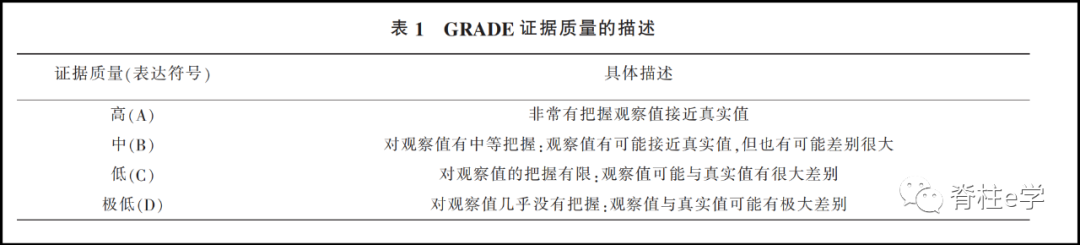 应用美国放射学会(American College of Radiology,ACR)使用的推荐分级的评估、制定与评价(Grading of Recommendations Assessment,Development and Evaluation,GRADE)方法评价证据质量,等级A-D代表研究质量由高到低(表1);