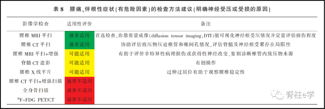 腰痛、伴根性症状(有危险因素)的检查方法建议见表8。