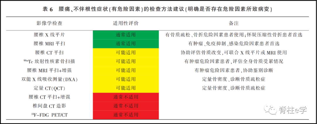 腰痛、不伴根性症状(有危险因素)的检查方法建议(明确是否存在危险因素所致病变)见表6。