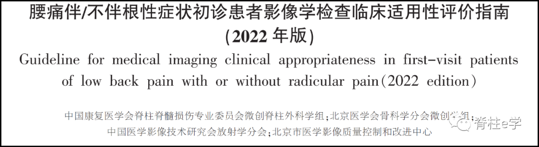 在此理念引导下,2022年,【中国康复医学会脊柱脊髓损伤专业委员会微创脊柱外科学组;北京医学会骨科学分会微创学组;中国医学影像技术研究会放射学分会;北京市医学影像质量控制和改进中心】制定了《腰痛伴/不伴根性症状初诊患者影像学检查临床适用性评价指南》。