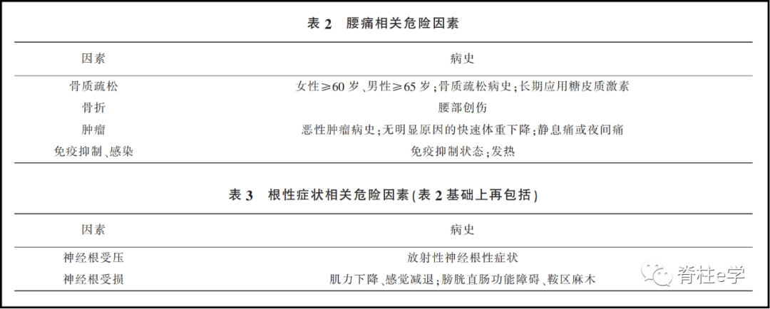 2.3 腰痛、不伴根性症状(有危险因素) 危险因素见表2。