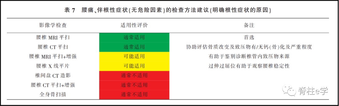腰痛、伴根性症状(无危险因素)的检查方法建议见表7。