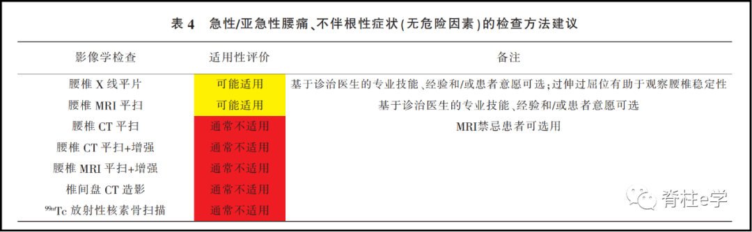 急性/亚急性腰痛、不伴根性症状(无危险因素)的检查方法建议见表4。