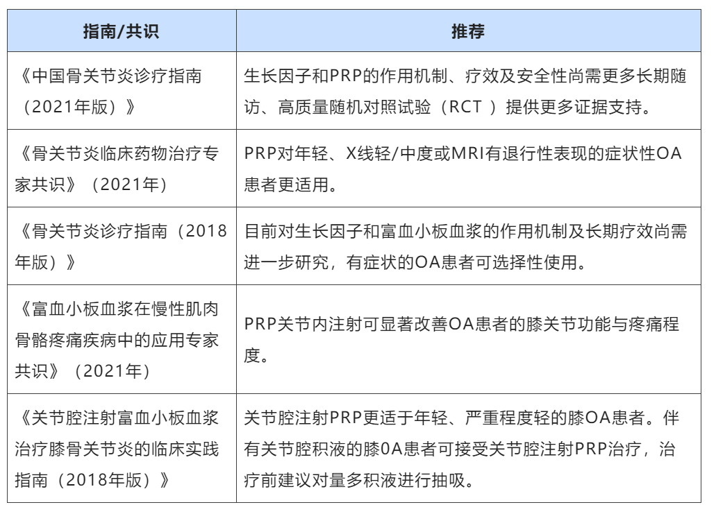 富血小板血浆(PRP)有保护软骨细胞、促进组织再生与修复、减轻关节内炎症、促进软骨愈合的作用,能缓解关节疼痛、改善关节功能,对半月板撕裂者其可显著改善愈合率,有效减轻临床症状。建议注射间隔时间一般为1-3周,2-3次为1个疗程。