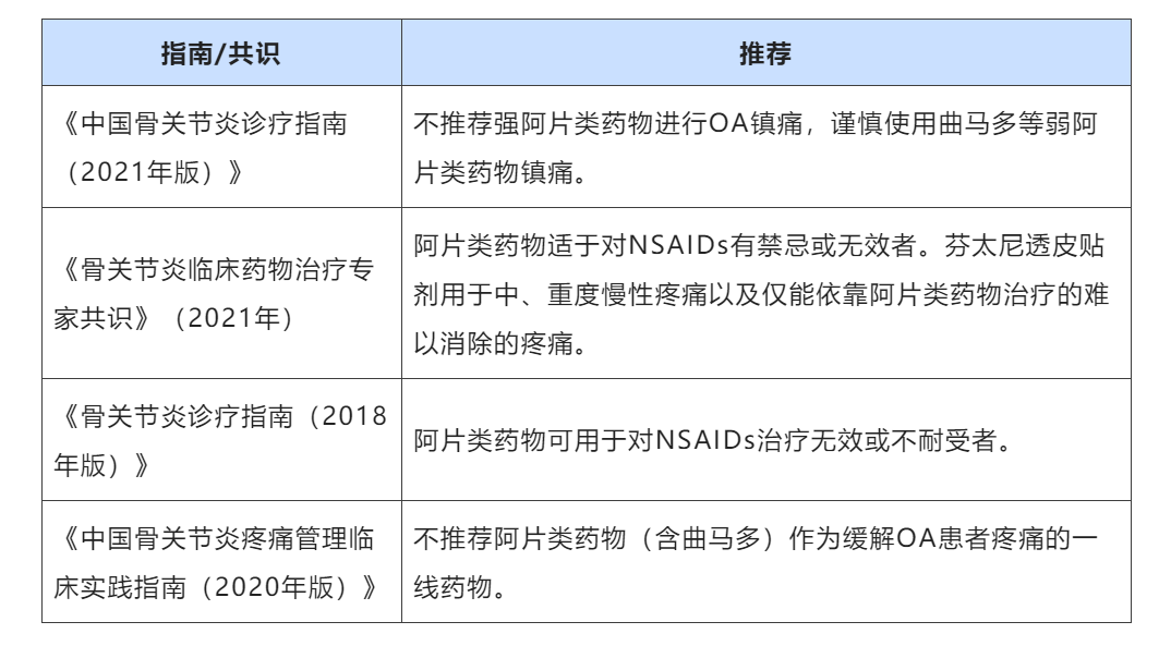 如吗啡、羟考酮、芬太尼、可待因、布桂嗪、曲马多、丁丙诺啡、双氢可待因、氨酚待因、氨酚羟考酮等,主要通过作用于中枢或外周的阿片类受体而镇痛,能抑制P物质的释放、阻止疼痛传入脑内、抑制下行疼痛,进而缓解OA患者疼痛,其中曲马多还可抗抑郁和焦虑症状,可用于中重度疼痛。