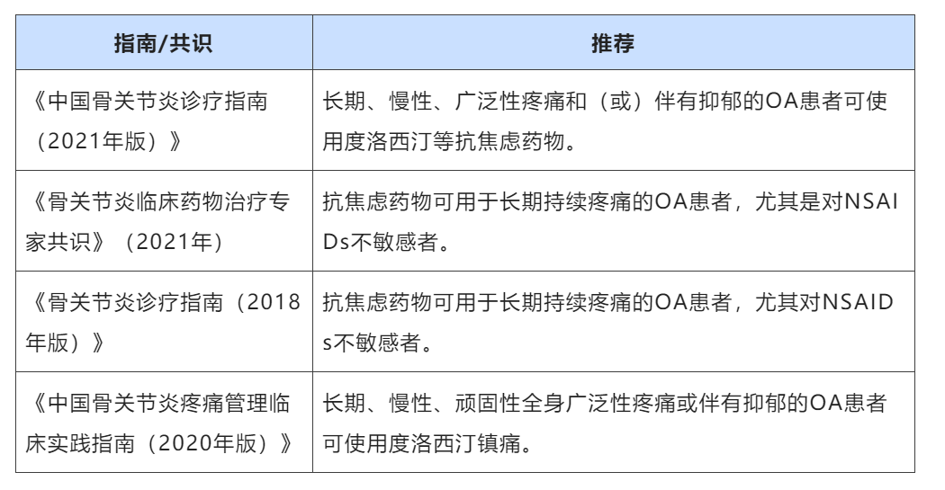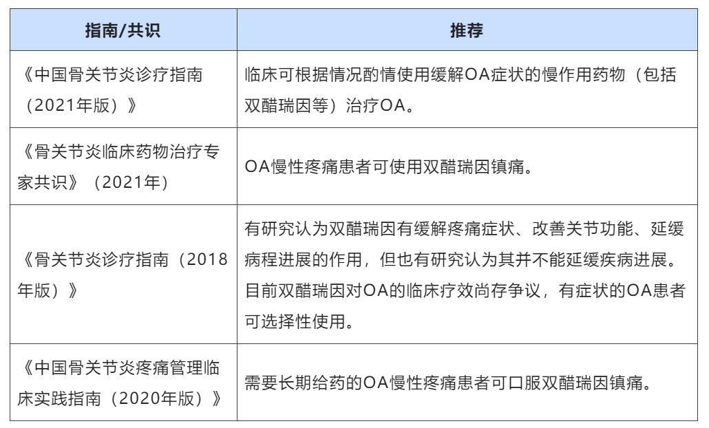 OA治疗包括基础治疗、药物治疗、手术治疗,其中治疗药物主要有非甾体类抗炎药物(NSAIDs)、阿片类药物、关节腔注射药物(如糖皮质激素、玻璃酸钠、医用几丁糖、生长因子和富血小板血浆)、缓解OA症状的慢作用药物(SYSADOAs)(如双醋瑞因、氨基葡萄糖)、抗焦虑药物等。那么,这些药物在OA治疗中该如何选用呢?