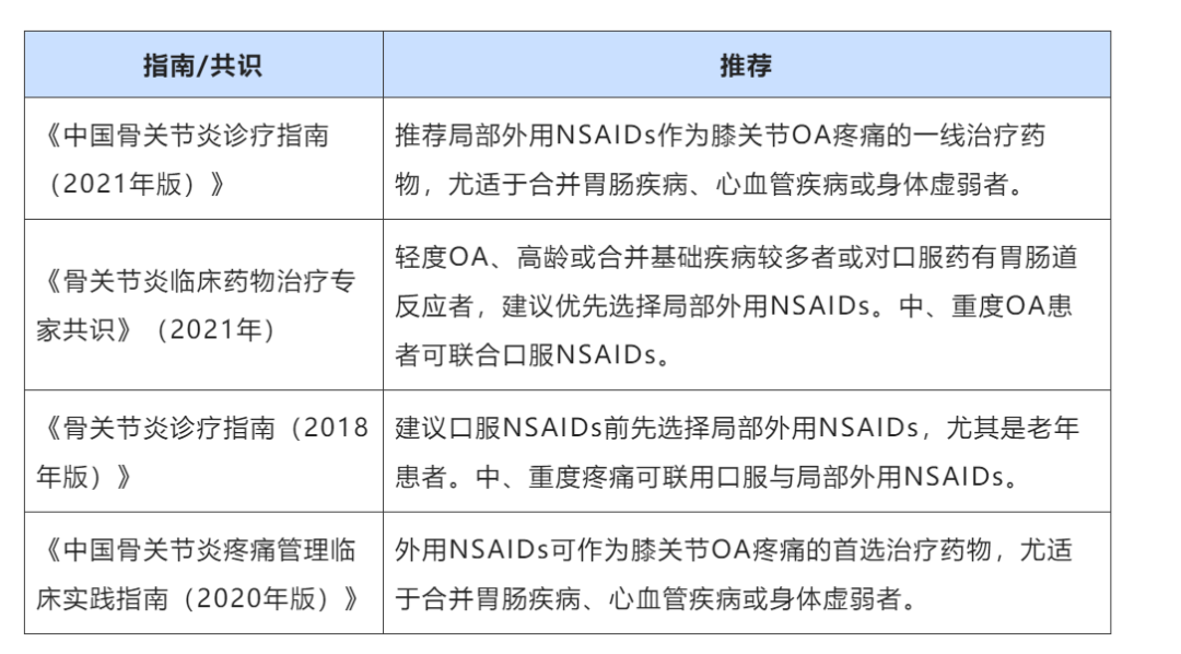 局部外用NSAIDs疗效最显著,包括双氯芬酸二乙胺乳胶剂、洛索洛芬钠贴剂、布洛芬凝胶、酮洛芬凝胶、氟比洛芬凝胶贴膏等,可迅速缓解关节的轻中度疼痛,且胃肠道反应轻微,可作为局部轻中度疼痛的一线治疗用药,尤其是疼痛部位局限时。