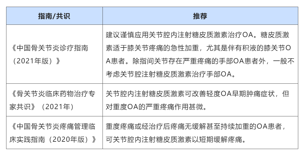 可抗炎、镇痛、降低毛细血管通透性、减轻充血、组织液渗出,其起效迅速,短期缓解疼痛效果显著,并改善关节功能,但对中长期疼痛和功能改善不明显,同时长期反复多次应用有加速关节软骨量丢失的风险。