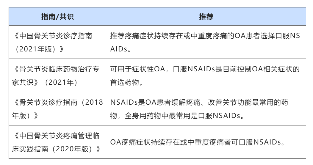 包括非选择性NSAIDs如布洛芬、双氯芬酸、洛索洛芬、舒林酸,以及选择性COX- 2抑制剂如塞来昔布、尼美舒利、依托考昔、艾瑞昔布等。胃肠道反应风险高者建议选用选择性COX-2抑制剂或非选择性NSAIDs联合质子泵抑制剂(PPI)。心血管风险较高者及身体虚弱者不建议将口服NSAIDs作为首选用药。