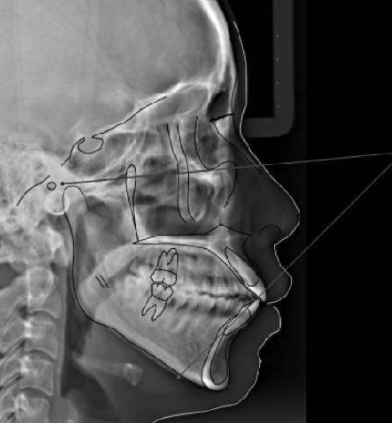 1、头影测量,测量出FMA、FMIA、IMPA、UI-LI的角度,标记出APo线(上牙槽座点与颏前点连线)(图1)。