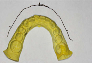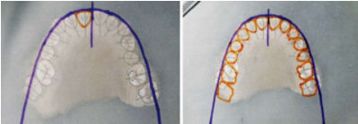 画有理想牙弓形态的硫酸纸,使理想弓形上对应牙位区的切线与各个牙齿长轴垂直,在理想牙弓的内侧逐次从前向后描画上各个牙齿的颌面像(图15)。