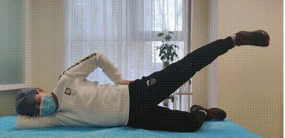 3)侧抬腿:侧卧位,上腿伸直做外展动作至最大幅度,脚尖始终保持朝向前方,脚尖由朝前变成朝上。