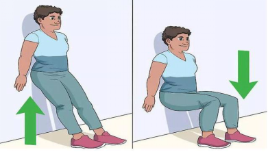 (1)靠墙静蹲 :背部贴墙,小腿与地面垂直,膝关节正对脚尖(可以在膝关节内侧夹球,防止膝盖内扣)。