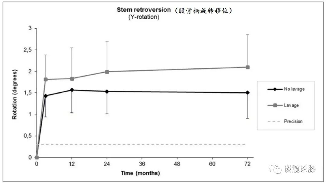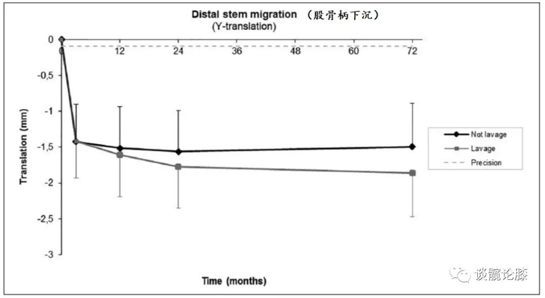 研究显示,两组在术后3、12、24、72个月等时间点上,假体下沉及旋转移位均无统计学上的差异,但冲洗组,移位值相对较高。随访6年,两组均无患者因股骨柄松动而翻修。